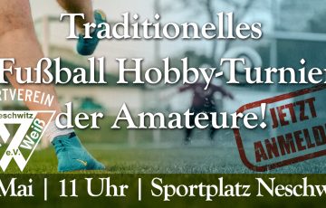 Es ist wieder soweit: das traditionelle Hobby-Fußballturnier am 01. Mai steht in den Startlöchern. Haben du und ein paar Freunde Interesse eine Mannschaft zu stellen? Die Spielzeit beträgt 10 Minuten...