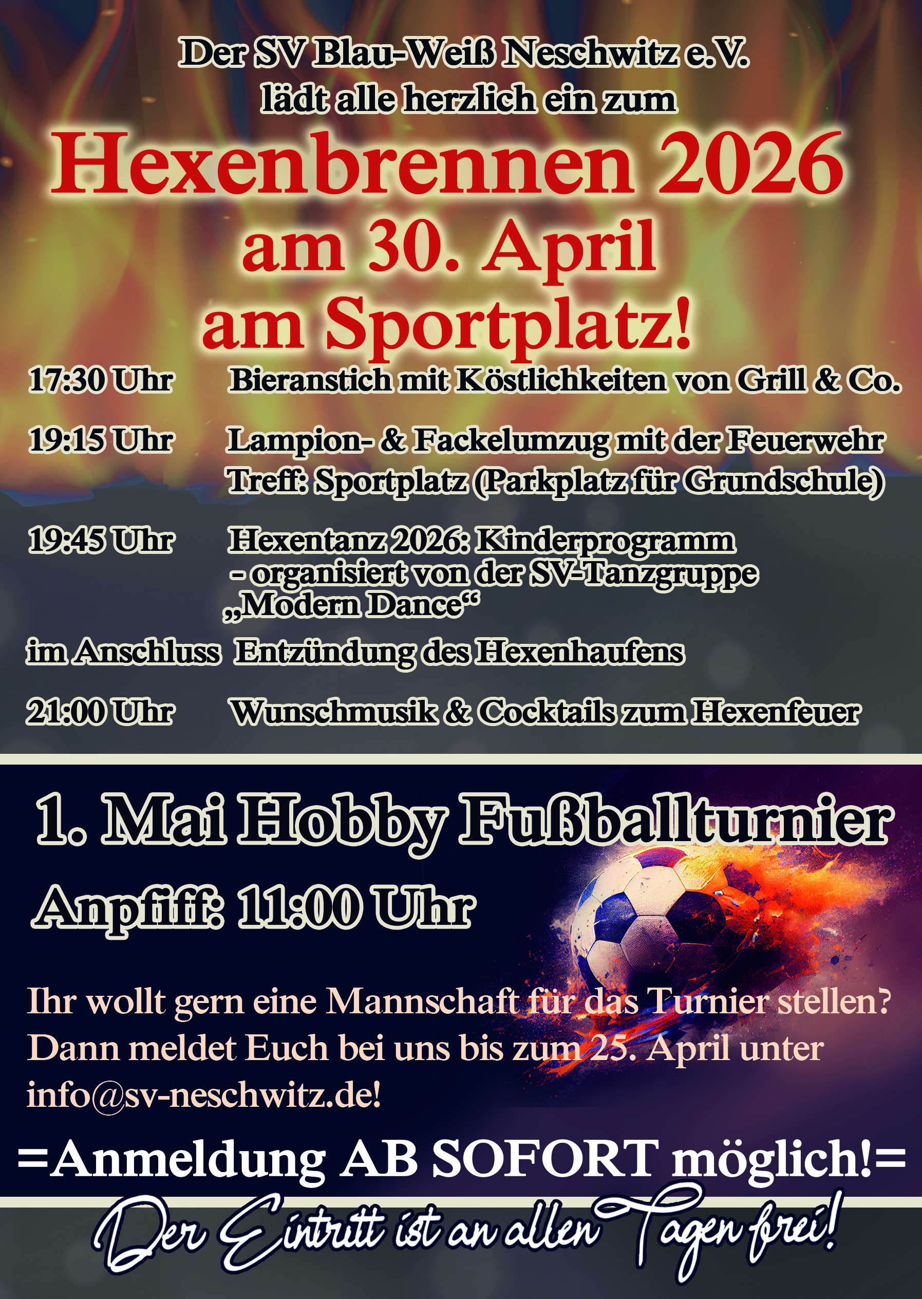 Am 30.04. organisieren der SV Blau-Weiß Neschwitz die Hexenbrennen-Veranstaltung.